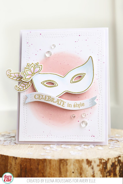 Elena created this first soft and pretty card. I love how she shaded the pink behind the white and gold mask and banner. It creates a lovely look.