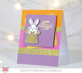 Caryn created this bright and cheery card.  I love how the purple, pink, orange and touch of gold look together.  That bunny looks so cute popping up out of that hat!  Caryn shows how you can use one great image to create a fabulous card.